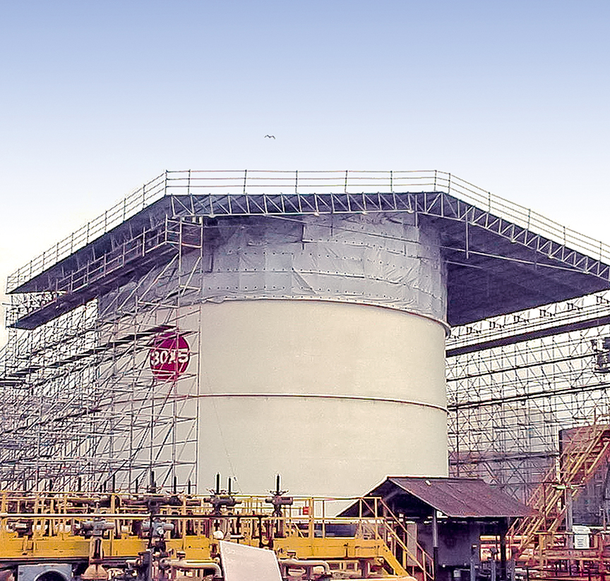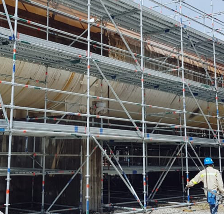 Scaffolding decks in specific designs such as round, trapezoidal or triangular for ideal adaptation to ship‘s curved hulls, on the propeller and rudder, on the superstructure or inside the cargo area.